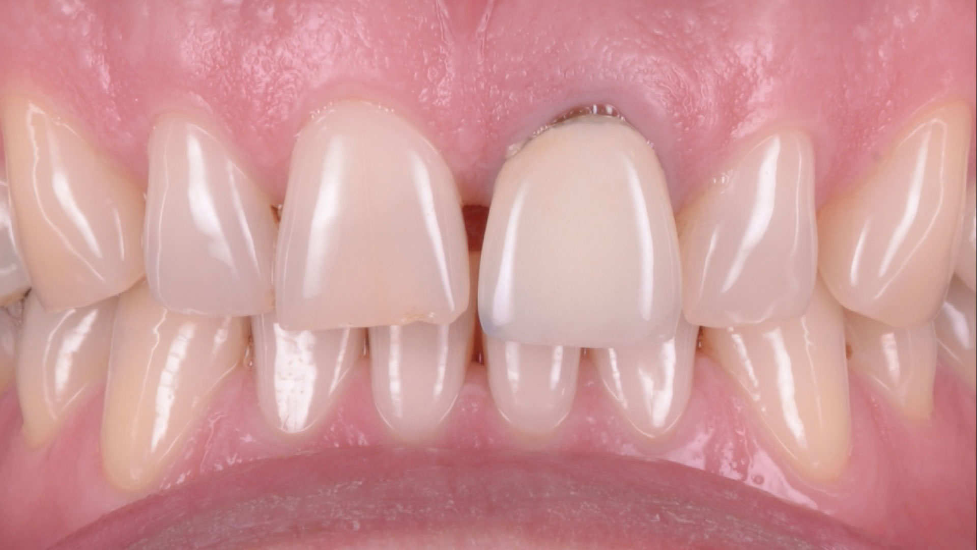 Cand medicul a scos coroana, a putut observa că dintele care fusese șlefuit pentru lucrarea veche și pe care fusese fixată lucrarea își modificase culoarea, semnalizând probleme în tratarea anterioară a acestuia. Acest aspect a avut ca rezultat un retratament de canal, realizat sub microscop, pentru ca mai apoi dintele să primească o coroană integral-ceramică. Coroanele integral-ceramice fac față cerințelor estetice și funcționale ridicate, de aceea sunt recomandate în majoritatea cazurilor.
