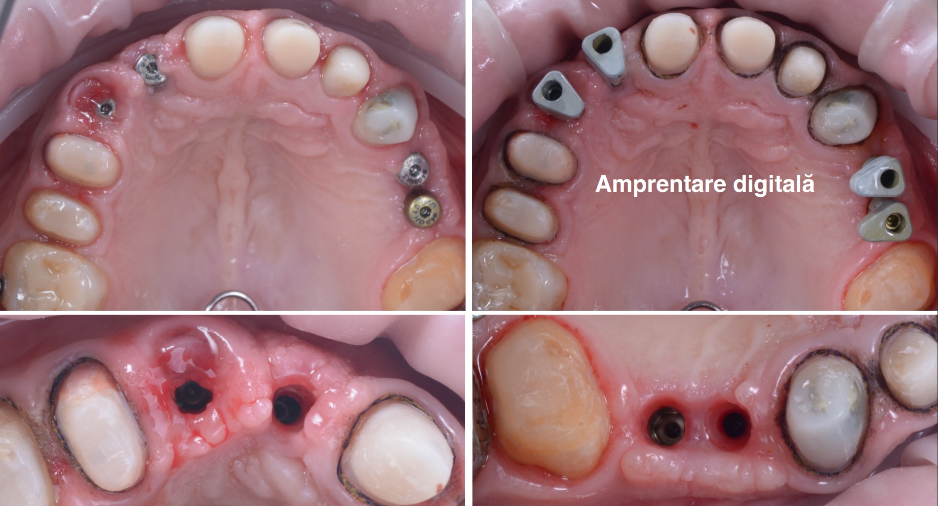A urmat etapa de descoperire a implanturilor. S-a amprentat digital pentru stalpi protetici hibrizi și restaurări protetice provizorii cad-cam din compozit, implanturile dentare trecând printr-o încărcare graduala. După maturarea țesuturilor s-a trecut în etapa finala unde pacientului i s-au restaurat dinții de la nivel maxilar cu restaurari protetice fixe, iar la nivelul arcadei inferioare s-au refăcut muchiile incizale și cuspizii caninilor din compozit cu scopul de a reda funcția în mișcările dinamice.