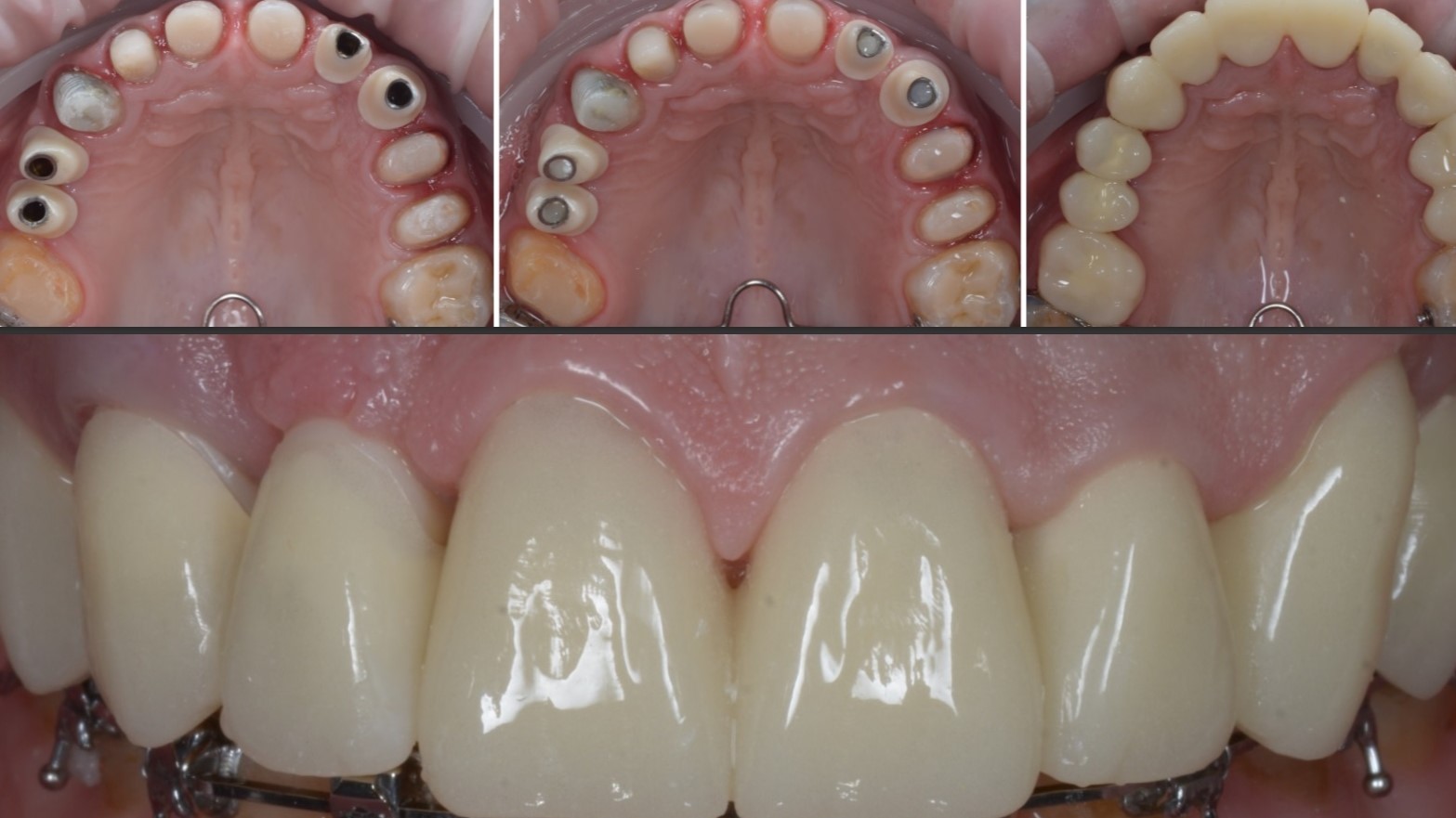A urmat etapa de descoperire a implanturilor. S-a amprentat digital pentru stalpi protetici hibrizi și restaurări protetice provizorii cad-cam din compozit, implanturile dentare trecând printr-o încărcare graduala. După maturarea țesuturilor s-a trecut în etapa finala unde pacientului i s-au restaurat dinții de la nivel maxilar cu restaurari protetice fixe, iar la nivelul arcadei inferioare s-au refăcut muchiile incizale și cuspizii caninilor din compozit cu scopul de a reda funcția în mișcările dinamice.